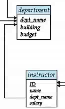 아래 그림에서 instructor relation의 dept_name가 department relation의 primary key로 사용되고 있습니다.