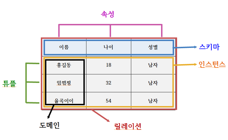 하나의 튜플은 각 attribute를 나타내는 요소들의 집합을 말합니다. 집합이라고 해서 다른 튜플과 중복이 허용되는 것이 아닙니다. tuple은 순서가 있는 요소들의 집합입니다. (pair -> tiple -> n-tuple)