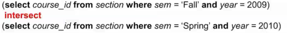위 SQL은 2009 가을 학기와 2010 봄 학기에 모두 열린 과목의 course_id를 가져오는 SQL입니다.