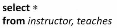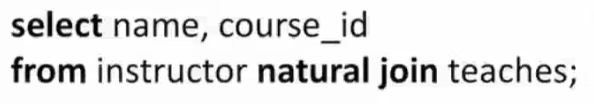 SQL에서 natural join 또한 가능합니다. 위의 sql문은 instructor table과 teaches table을 카티시안 곱하고,